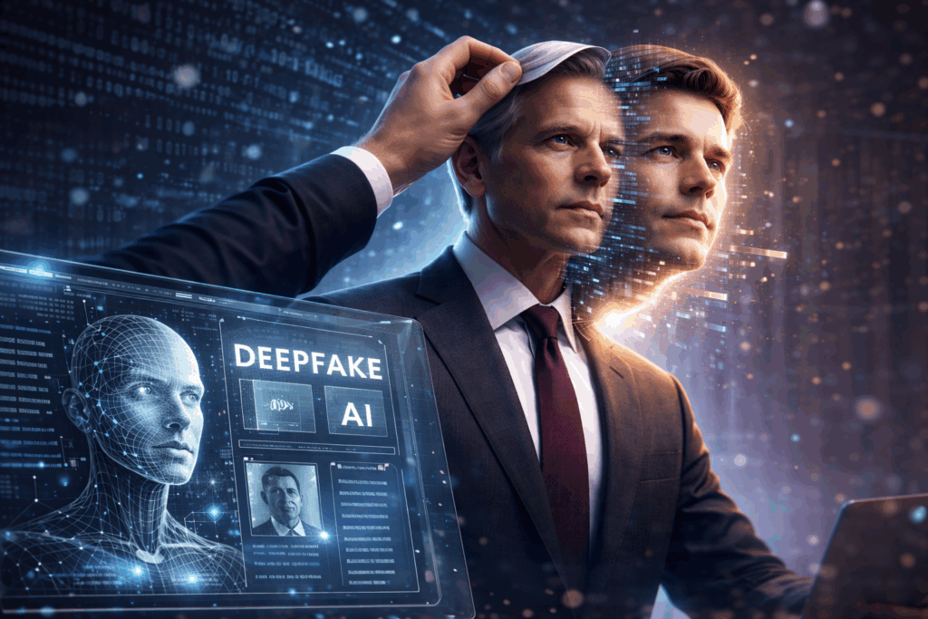 ディープフェイク(Deepfake)はAI(特に深層学習)を使って、人の「顔・声・動き」を本物そっくりに作り替える技術のことをいいます。「ディープラーニング(深層学習)」と「フェイク(偽物)」を組み合わせた造語でディープフェイクと呼ばれています。人の顔や声を入れ替えたり、実際には言っていない言葉を話させたりすることが可能で、映画などのエンタメ分野での活用が期待される一方、フェイクニュース、詐欺、情報操作、名誉毀損などの悪用が深刻な社会問題となっています。