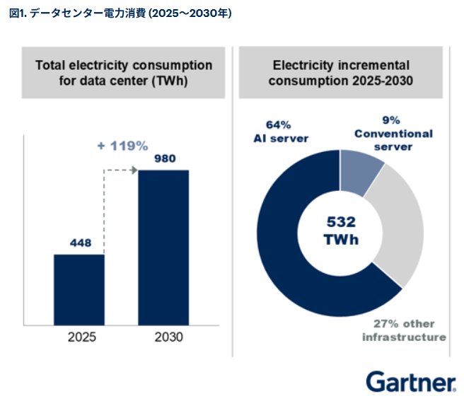 米国のリサーチ&アドバイザリー企業であるGartnerは、世界のデータセンターの電力需要は2025年に16%増加し、2030年までに2倍になるとの見通しを発表。Gartnerのアナリストは、世界のデータセンターの電力消費量が2025年の448テラワット時(TWh) から2030年には980TWhに増加すると予測しているとしています。また、データセンターの追加電力需要の64%をAI最適化サーバーが占めることになるとしており、その緊急性を訴えています。