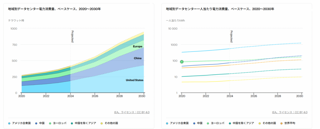 IEAにおいても、世界のデータセンター全体の電力消費は2030年までにほぼ2倍に増加し、AIを動かすためにデータセンターやクラウド上で実行される処理やタスクである、AIワークロード(加速サーバー)が消費増加の主要因となる、と分析しています。その中でも、データセンターの電力消費量の増加が最も顕著な地域は中国と米国で、2030年までの世界全体の増加分の約80%を占めるとの報告をしています。