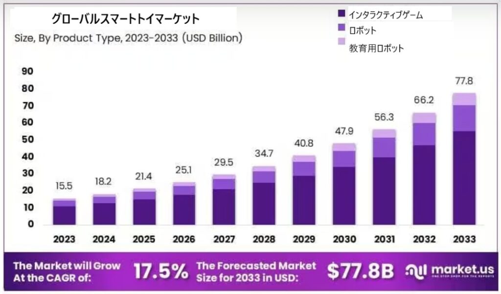 スマートトイのマーケットレポートによると、世界のスマート玩具市場規模は2023年の155億米ドルから