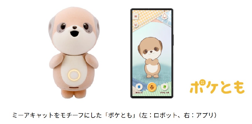 今回出展されたポケともは身長約12cm、体重約200gでミーアキャットをモチーフにデザインされています。本体のみではなく、専用のスマホアプリを使うことで外出先からも本体とコミュニケーションをとることができます。口の中にカメラが搭載されており、会話の内容のほかに見た景色なども記憶するように作られています。長い時間をかけて会話やカメラからの情報を記憶していくことで、持ち主のことを理解していき、寄り添ってくれるパートナーへと育っていきます。また、身振り手振りで感情豊かに対話をするほか、お腹のランプが虹色に光り、うれしい気持ちを伝えてくれるなどの機能があります。カバンに付けて持ち運ぶこともできるサイズ感で、常にそばにあることで一人一人の寂しい気持ちに寄り添う作りになっているとのことです。