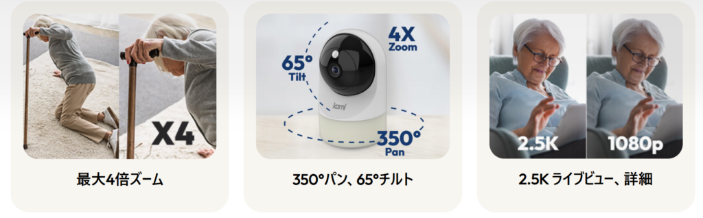 Kami Fall Detect Cameraは、アメリカのKami Vision(カミビジョン)社によって開発されたAI搭載の高齢者向け転倒検知カメラです。AIカメラが転倒を自動検知し映像付きで通知するシステムで、公表情報では約99%の転倒検知精度があるとのこと。転倒は要介護度を大きく引き上げる重大リスクであるため、検知精度という数値で評価できる点は、導入検討時の重要な判断材料になります。