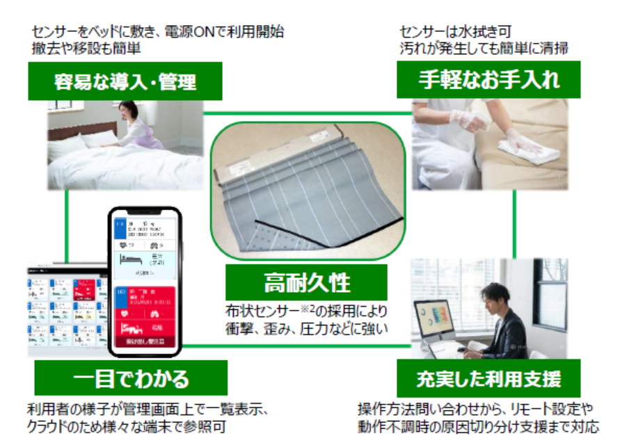 OKIが提供する「WatchOverSmart」は、ベッド上に設置したセンサーで離床や転倒予兆を検知し、スタッフへリアルタイム通知を行う見守りAIです。映像に頼らず動作データを解析する設計のため、プライバシーに配慮しながら常時見守りが可能となっています。また、夜間の巡視回数削減や介護負担軽減につながるとして、介護・生活支援ロボット認証も取得しています。