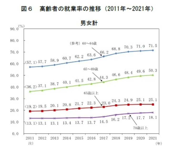 実際に65 歳以上の就業者等は増加し続けており、65 歳以上を一律に高齢者と捉えることは現実的ではないとされています。実際に、2021年の段階でも65~69歳の就業率は50%を超えているのです。