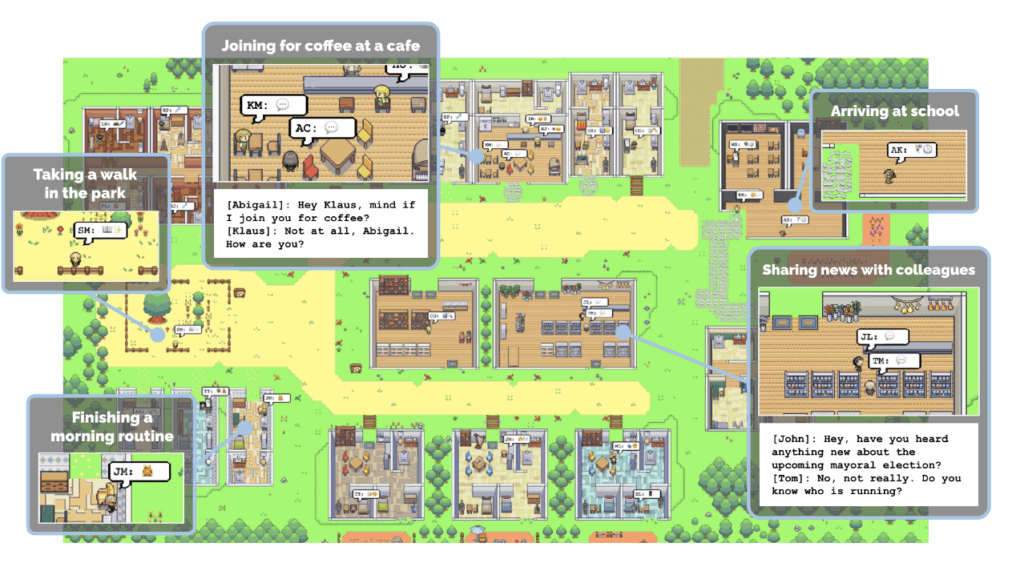 この研究は、NPCに「短期記憶・長期記憶・内省」を与えた世界シミュレーションを行うというもので、プレイヤーの直接操作なしで小さな街にNPCを配置するだけで街が勝手に動き始めるという結果が出ています。。NPCはただのプロンプト駆動ではなく、NPCは日々の出来事を文章として保存(記憶)します。記憶は、時系列で重要度を加味して関連性を持たせて記憶され、必要なときに検索されます。また、一定時間ごとにNPCは自分の記憶を振り返ることで、出来事が再解釈され、NPCごとに“性格の変化”が生まれます。また、内省をもとに、NPCは翌日の行動計画を立てます。台本などは全くなく、これらを毎日・時間ごとにループしていくことで、研究者を驚かせるある出来事が起きました。