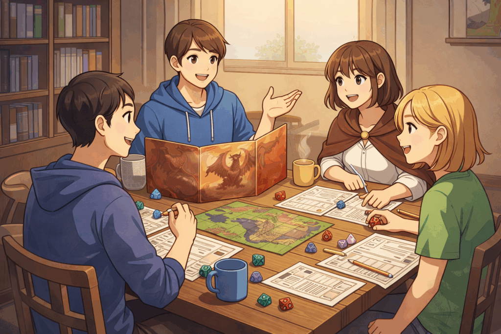 NPCの原型は1970年代にアメリカ誕生したテーブルトークRPGです。テレビゲームとしてではなく、サイコロと会話、そして想像力で遊ぶ“机の上で物語を紡ぐゲーム”として誕生しました。プレイヤー同士が会話で物語を進め、その世界で演じるキャラクターとして旅していきます。そのキャラクターはプレイヤー ( 物語の主人公)、ゲームマスター( 世界の語り手・進行役)、NPC(世界に住む人々)に分かれます。それらは世界観の補強として誕生しました。