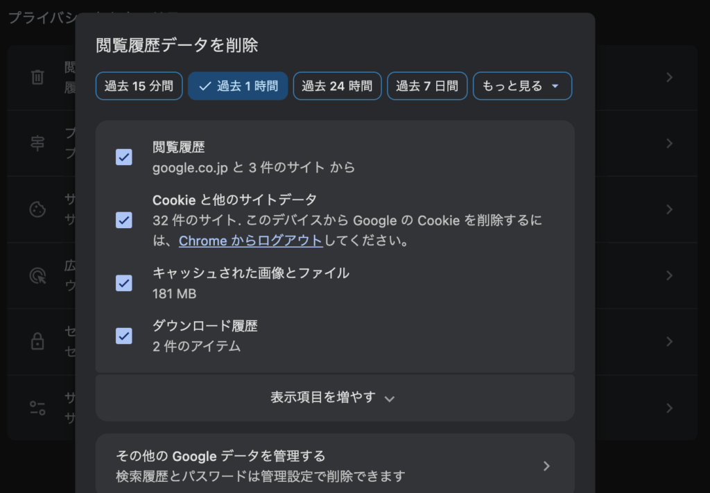 一方でブラウザ内部の一時ファイル・画像・読み込みデータなどは削除され、再読み込みが必要になります。