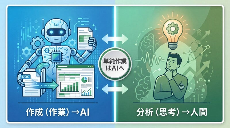 Excel業務は「分析(思考)」と「作成(作業)」に分けられます。 表構築や関数入力などの「単純作業」をChatGPTに任せれば、手間や時間の大幅削減が可能です。