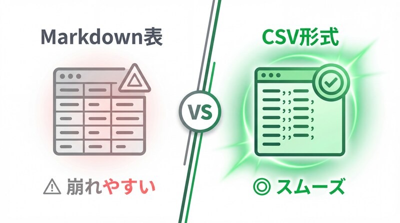 Excelへの貼り付けは「CSV形式のコードブロック」での出力指示が推奨されます。カンマ区切りならデータ構造を正確に認識できるためです。