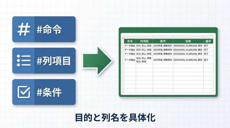 | セル位置の明示 | 「A列の商品IDをキーに、C列を検索」 | 参照範囲のズレや、引数の順序ミスを防ぐ |