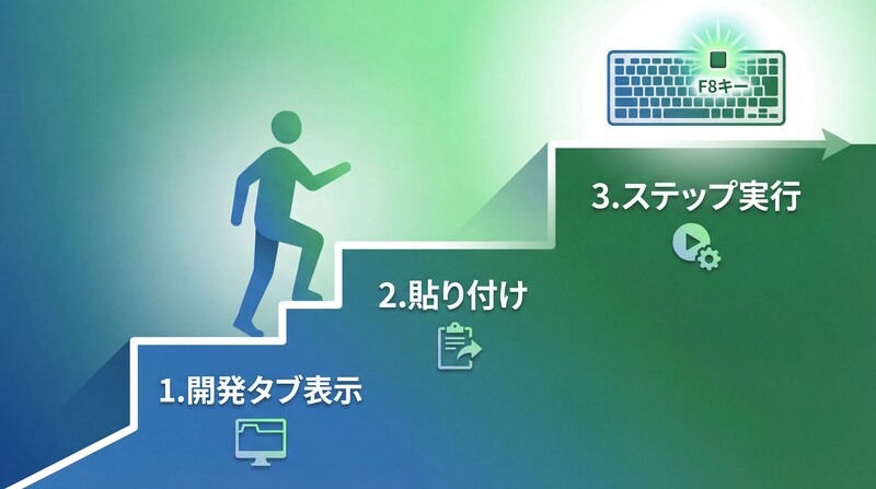 F8キーによるステップ実行により、意図しない削除や誤入力を防ぎながら安全にテストできます。