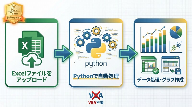 Pythonコードが内部で実行されるため、VBAを使わずに複雑なデータ処理やグラフ作成を自動化したい場合に有効です。