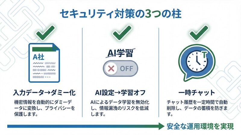 ダミー化・学習オフ設定・一時チャットを組み合わせることで、情報漏えいリスクを最小限に抑えられます。