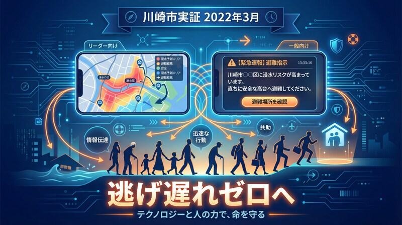 2022年3月に川崎市で実施された防災訓練では、AI津波予測技術を組み込んだスマートフォンアプリを使い、避難行動の変化を検証しました(出典:川崎市での実証実験に関する発表)。