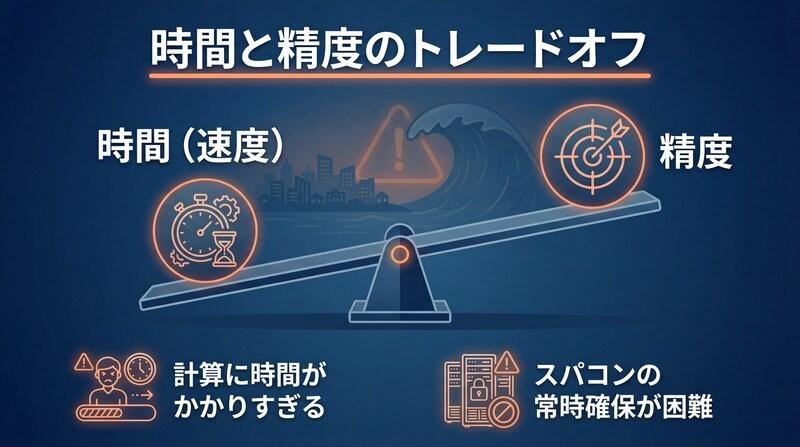 建物の影響まで考えた高精度な物理シミュレーションを行うには、膨大な計算処理が必要です。発災直後の限られた時間内では、計算が終わる前に津波が到達するおそれがあります。