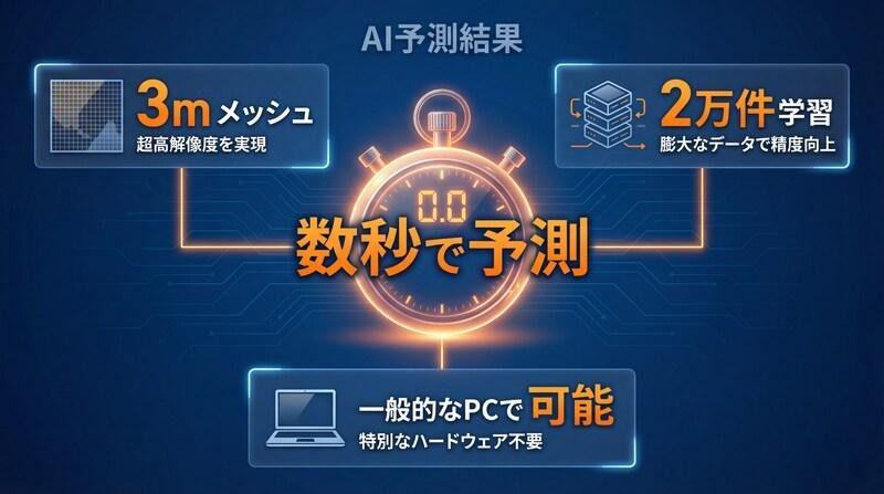 2万件のシナリオをAIに学習させた結果、一般的なPCでも数秒以内に3mメッシュの高精度な浸水予測が可能になりました。