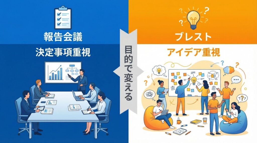 報告会議かアイデア出し(ブレスト)か、目的に合わせて出力項目を変えましょう。会議の種類によって、記録すべき情報の優先順位が違うからです。