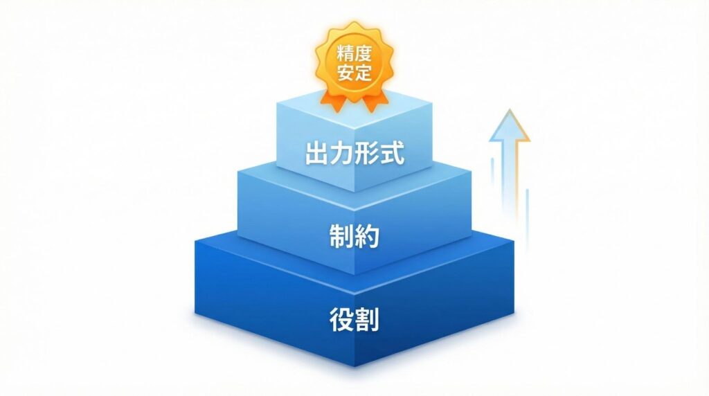 「役割」「制約」「出力形式」を決めた構造化プロンプトを使いましょう。役割・制約・出力形式を定義することで、精度が安定します。