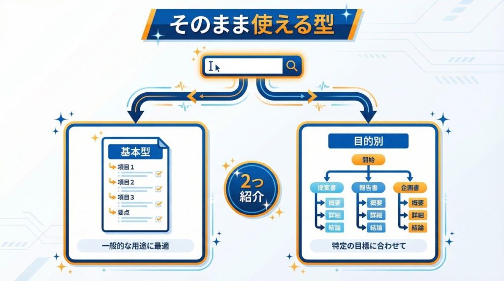 AIへの指示(プロンプト)次第で、議事録の質は大きく変わります。指示があいまいだと、要点が抜けたり、話し言葉が混ざったりするからです。そのまま使える型を、以下の2つ紹介します。