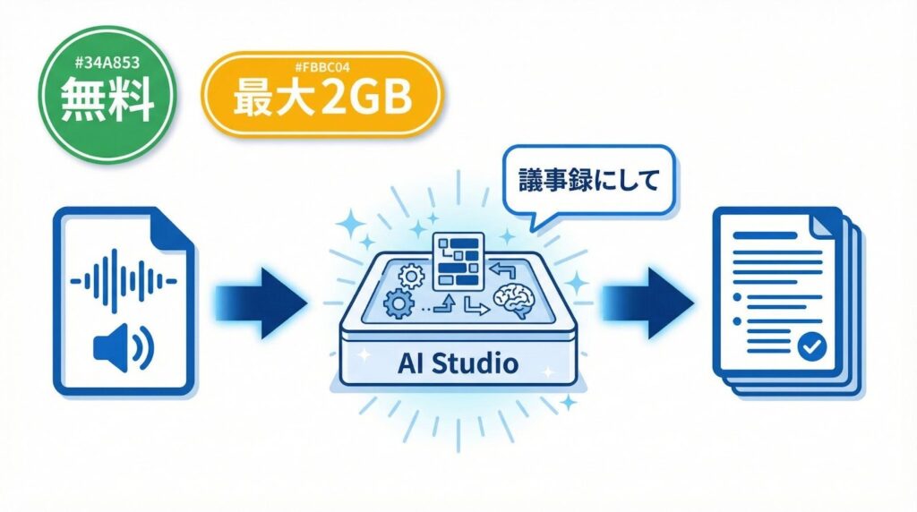 Zoomの録画やICレコーダーの音声がある場合は、「Google AI Studio」を活用しましょう。無料のスマホアプリでは扱えない長時間(10分以上)のファイルを、無料で処理できるからです。(出典:Google AI Studio機能概要)