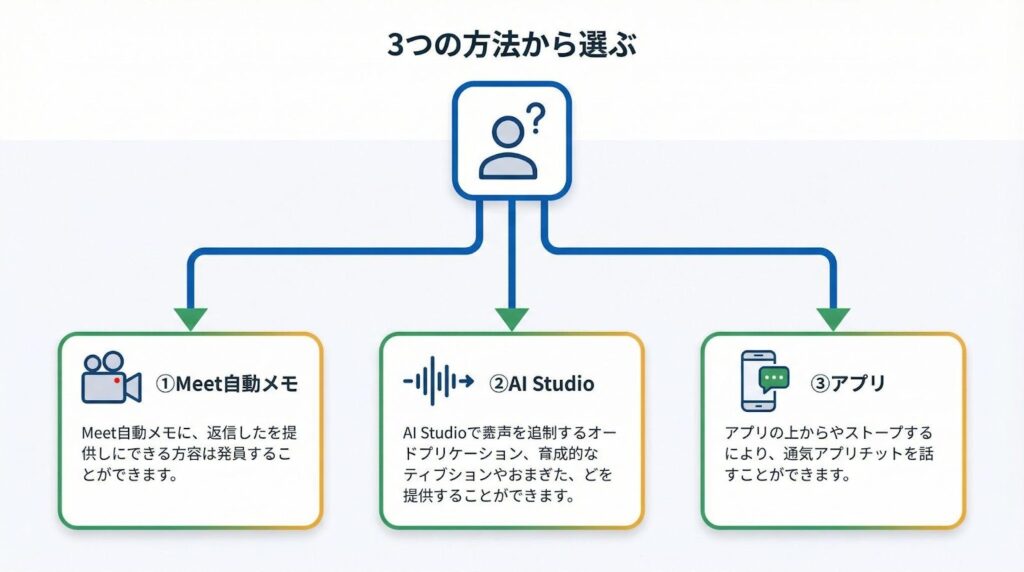 会議形式やデータの有無によって、最適なツールは異なります。以下の3つの方法から、自分の状況に合うものを選びましょう。