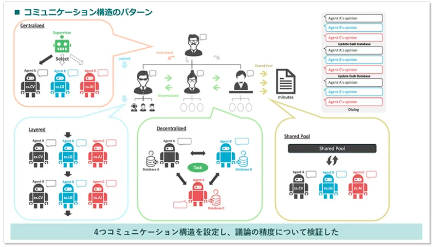 | 4種類の連携アーキテクチャ | 分散型、集中型、層別型、共有プール型といった4種類を、タスク内容によって使い分けできる。 |