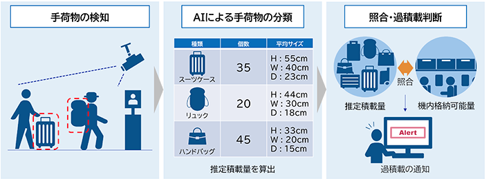 本ソリューションの特徴は、AIを用いて個数を数えるだけではなく、認識した手荷物のサイズや形状に基づき、それが機内の収納棚のスペースをどれだけ占有するかという積載量を自動で推定します。
