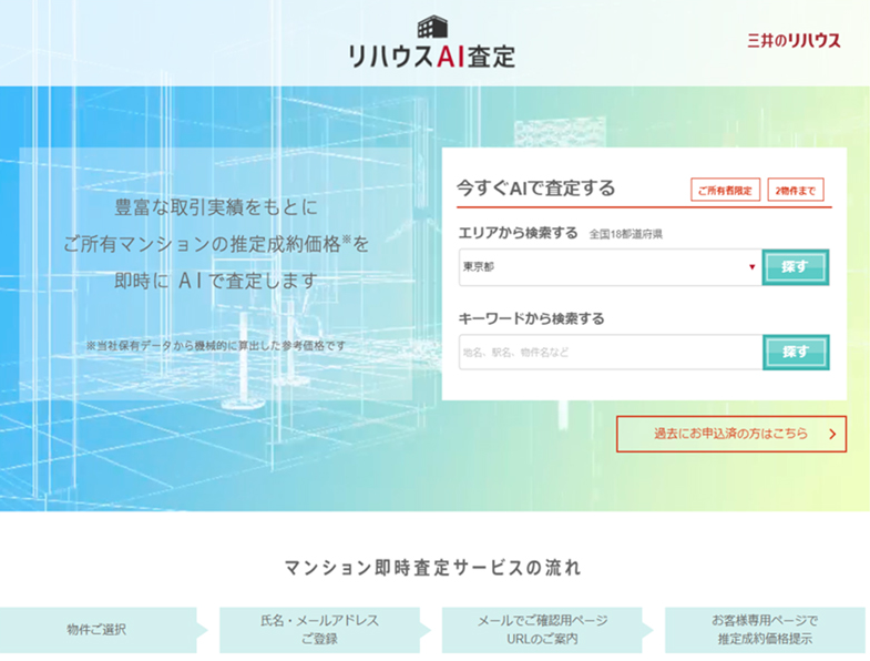 三井のリハウスが展開しているサービスのひとつが、「リハウスAI査定」です。「リハウスAI査定」は、顧客が査定したい物件を検索し、階数や部屋番号、氏名、メールアドレスを入力すると、最新の不動産価格を把握できます。