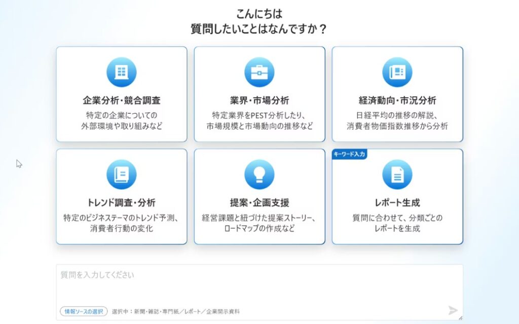 市場動向や競合調査を高速に実施・新規事業のリサーチを効率化・業界・技術トレンドの把握・事業計画策定の材料収集など、 戦略立案の情報収集に強い
