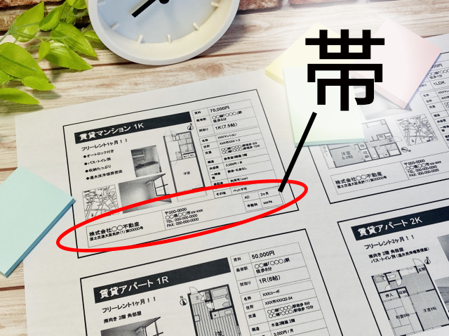 - 「帯」とは、不動産チラシの端に入っている帯状のエリア(主に価格や問い合わせ先を記載)