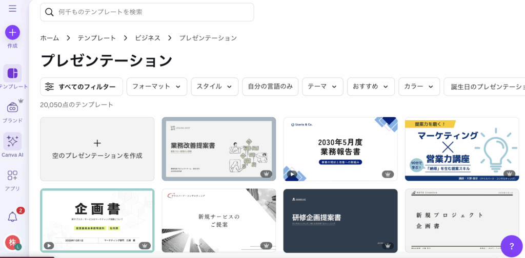入力が完了したらエンターキーを押すと、数秒から十数秒程度で複数のデザイン案が提案されます。生成されたプレゼン資料は一覧表示されるため、その中から気に入ったデザインを選択できます。