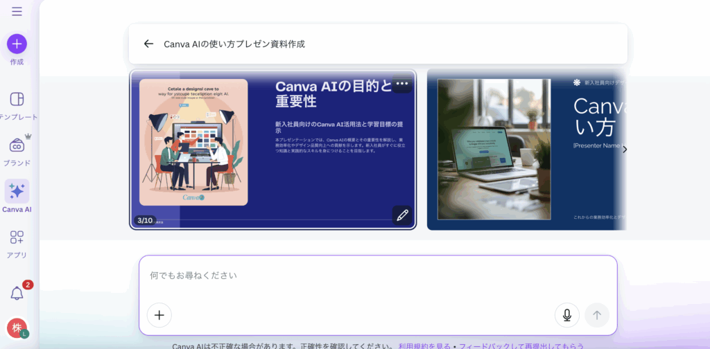 デザインスキルや専門知識がなくても、テキスト入力や画像のアップロードだけで、SNS投稿からプレゼンテーション、動画コンテンツまで幅広く対応できる点が大きな特徴です。この機能を使いこなせば、デザイン作成にかかる時間を大幅に削減しながら、クオリティの高い仕上がりが実現できます。