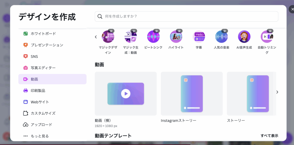 まず、Canvaのホーム画面から「動画」テンプレートを選びます。動画用Magic Designは、SNS動画(InstagramリールやTikTok動画など)および1920×1080px(水平)、1080×1920px(垂直)、1080×1080(正方形)の動画の文書タイプで利用できます。使いたいプラットフォームに応じたサイズを選択しましょう。