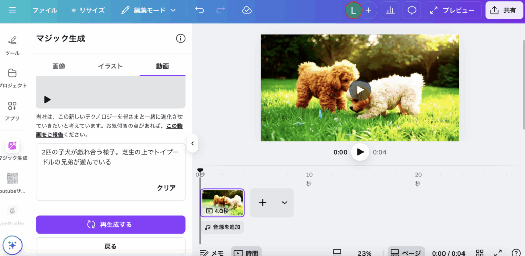 Magic Designのパネルが開いたら、作りたい動画の雰囲気や内容を短く説明する文章を入力します。たとえば「2匹の子犬が戯れ合う様子。芝生の上でトイプードルの兄弟が遊んでいる」といった表現が有効です。入力後、「動画の生成」ボタンをクリックすると、AIがアップロードした素材を組み合わせて、複数の動画パターンを自動生成します。
