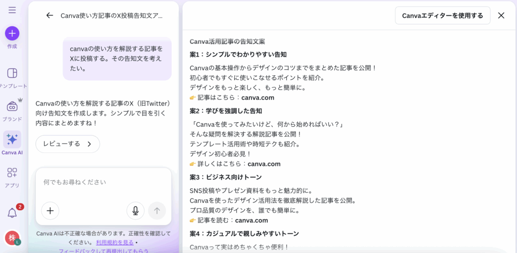 ここで投稿のテーマやイメージをテキストで入力すると、AIが複数のデザイン案を自動生成してくれます。たとえば「カフェの新メニュー紹介、温かみのある雰囲気」といった具体的な指示を入力すれば、よりイメージに近いデザインが提案されるでしょう。