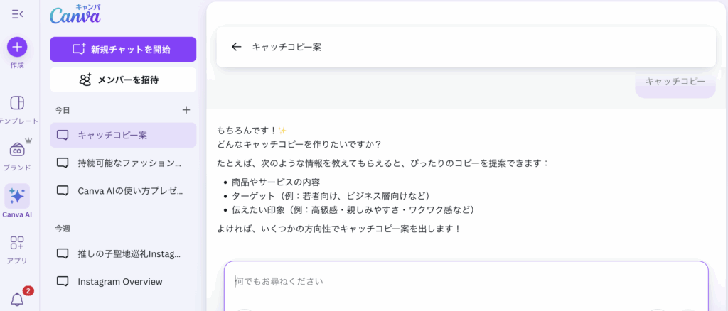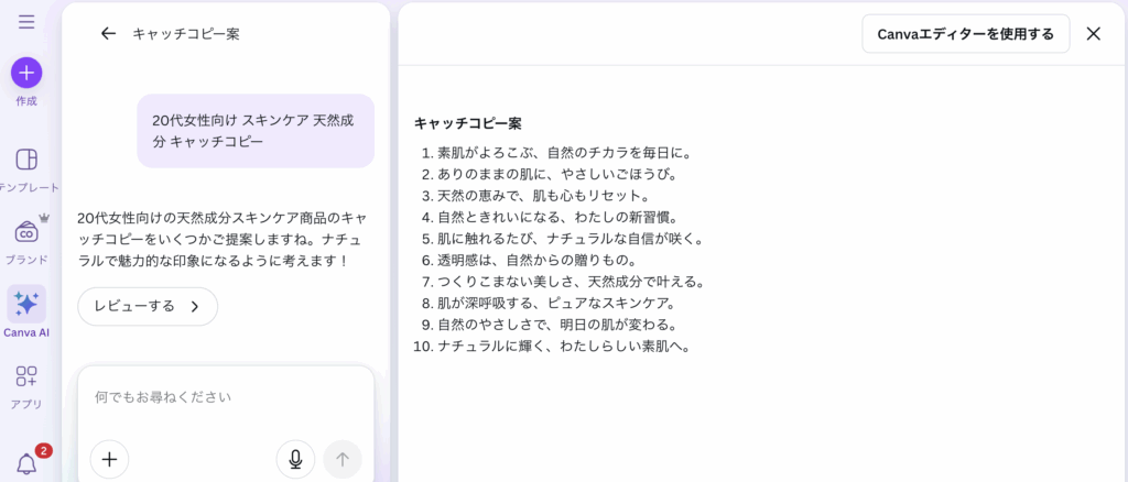 キャッチコピーを作成する際は、商品やサービスの特徴、ターゲット層、伝えたいメッセージを明確にして入力することが重要です。「20代女性向け スキンケア 天然成分 キャッチコピー」といった具体的な指示を出すと、ターゲットに響く表現が生成されます。