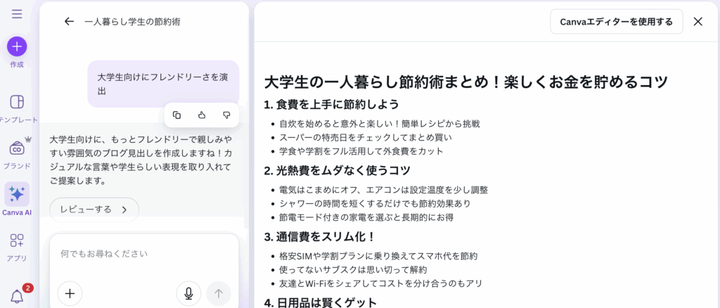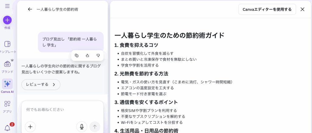 ブログ記事やWebコンテンツの見出しは、読者が内容を読むかどうかを決める重要な要素です。Magic Writeに「節約術 一人暮らし 学生 記事見出し」といった情報を入力すれば、読者の興味を引く見出し候補がいくつも提案されます。