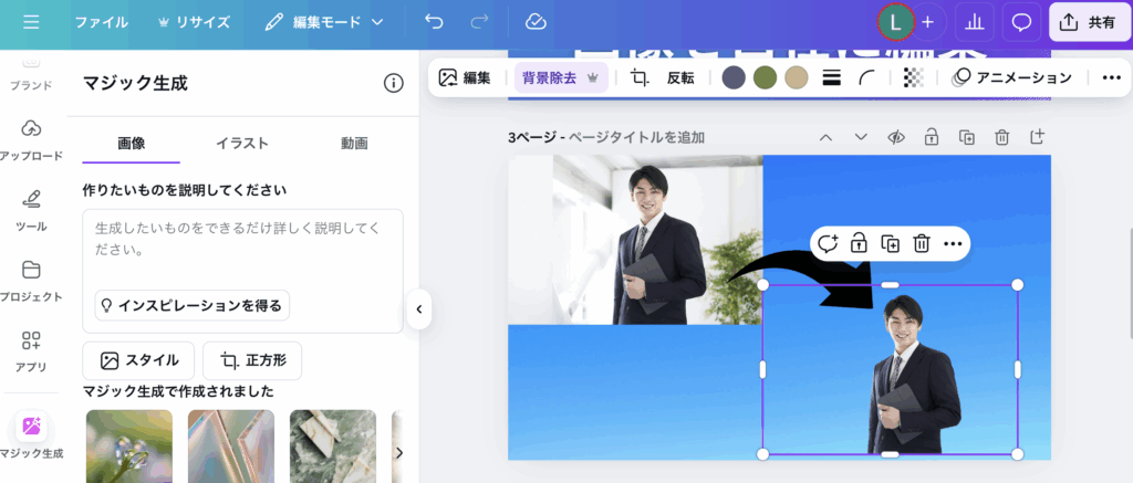 Magic Editを使った背景の置き換えは、非常にシンプルな操作で実現できます。まず、編集したい画像をCanvaにアップロードし、画面上に配置してください。